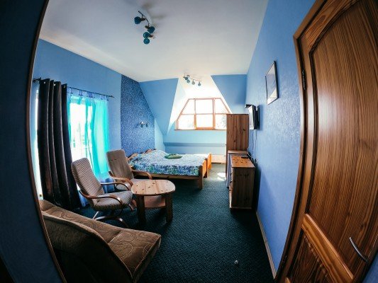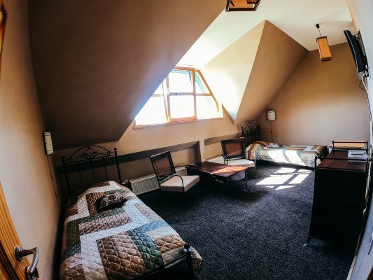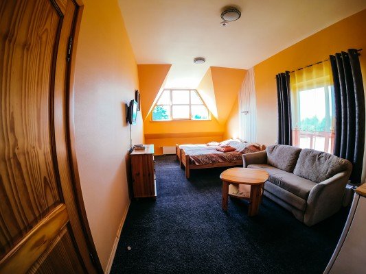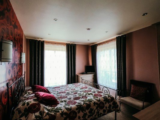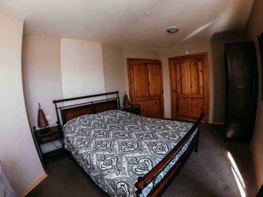 A room for a romantic getaway with a view of the sunset over treetops and a large double bed.